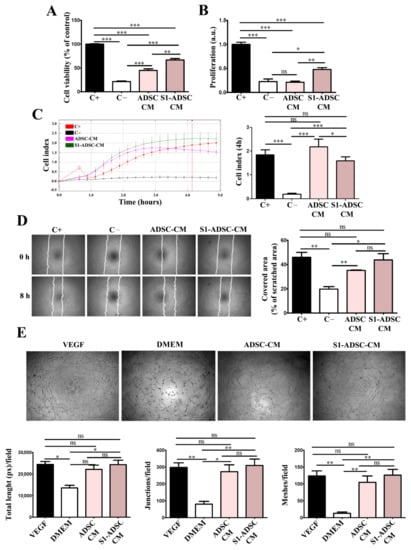 Next, the effect of S1-ADSC-CM on the angiogenic properties of EC was investigated by an in vitro tube formation assay (Figure 6E). The morphometric analysis revealed no statistically significant difference between the S1-ADSC-CM, ADSC-CM, and the positive control consisting in EC incubated in the presence of 50 ng/mL VEGF, a strong pro-angiogenic factor.