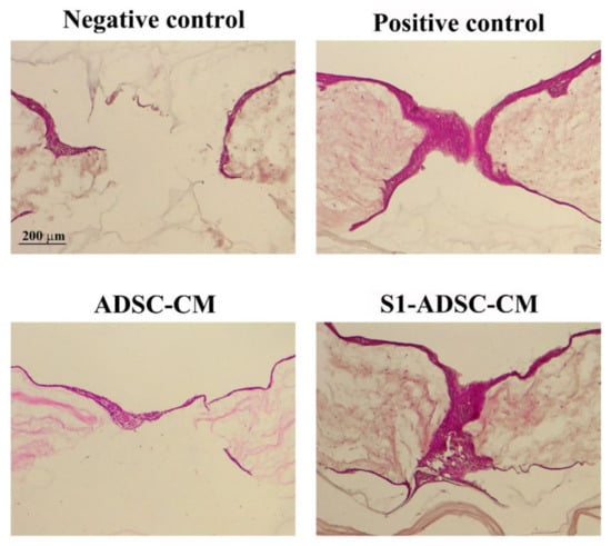 The production of human skin organotypic cultures (OTC) has been previously established []. In short, the dermal equivalents were obtained by mixing fetal bovine serum containing 3.75 × 105/mL hDF with 10× Hank’s buffered saline (Sigma Aldrich, St. Louis, MO, USA) and bovine type I collagen (Thermo Fisher Scientific, Waltham, MA, USA) in a proportion of 1:1:8 (volumes). The gel was cast on 24-well polycarbonate inserts (Merck Millipore, Burlington, MA, USA) and complete culture medium was added in both compartments for 24 h. Next, 1 × 105 keratinocytes/insert (HaCaT cell line) were seeded on top of the collagen layer. After 4 days, the 3D culture was raised to the air–liquid interface, and the medium was supplemented with 2 ng/mL TGFα (Thermo Fisher Scientific, Waltham, MA, USA), 100 ng/mL GM-CSF (Thermo Fisher Scientific, Waltham, MA, USA), and ascorbic acid (Sigma Aldrich, St. Louis, MO, USA) to a final concentration of 50 mg/L. After another 3 days, a blunt needle was used to perform a full-thickness lesion. The wounded constructs were transferred on top of another collagen gel containing fibroblasts and incubated in complete medium (positive control), serum-free DMEM (negative control), and CM (ADSC-CM and S1-ADSC-CM). The skin equivalents were fixed in 4% PFA at day 0 and day 3 post-wound and processed for cryosectioning. The cryosections were stained with hematoxylin and eosin and the slides were examined using a Leica DM750 microscope (Leica, Wetzlar, Germany).