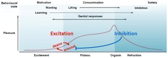 Depiction of Masters’ and Johnson’s “EPOR” model of human sexual response and related the activation of corresponding excitatory (red) and inhibitory (blue) brain regions. Opioid and serotonergic transmissions at orgasm activate inhibitory feedback on mechanisms of sexual arousal and desire. Adapted with permission from Georgiadis, Kringelbach, and Pfaus [] (2012. Nature Publishing Group).