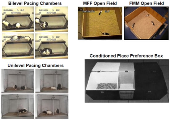 Both CPP and conditioned partner preference were also demonstrated in female rats. Previous studies demonstrated that females develop a preference for the non-preferred side of the CPP box if the contextual cues are paired with paced, versus non-paced copulation in unilevel pacing chambers [,]. Bilevel or unilevel pacing chambers allow females to control the initiation and rate of copulation, either by running from level to level [] or to exit from and return to the side with the male through a divider with holes that accommodate the female to pass through, but that are too small for the male to pass through [], respectively (see Figure 3). Importantly, pacing conditions in the unilevel chamber can be modulated simply by removing the divider. With the divider, the female controls the initiation and rate of copulation. Without the divider, the male is more likely to control the initiation and rate. Females also developed a conditioned partner preference based on a neutral almond odor placed on a male rat in either bilevel chambers or unilevel chambers with the divider []. Using a similar conditioning training procedure as Kippin et al. [], paired females developed a preference for scented versus unscented males which they displayed on a final open-field test with two tethered males, one scented and the other unscented: Females showed more solicitations of the scented males, more high-magnitude lordosis, and chose the scented male more often to receive his ejaculations. Systemic naloxone administration blocked the development of this conditioning []. Similar results were obtained when the strain of male (pigmented vs. albino) was used as a composite CS [] and when the rodent jacket was used as a CS on the male [].