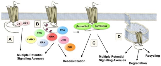 Structure and function of the μ opioid receptor and interaction with second messenger systems. The schematic demonstrates key points in opioid receptor signaling and regulation that was shown to be influenced by differential agonist occupation. A, heterotrimeric G proteins represent 16 individual gene products for Gα, 5 individual gene products for Gβ and 11 for Gγ proteins. Together, the diversity arising from heterotrimeric G protein subunit composition presents a gateway to potentially high diversification of agonist-directed coupling between μ opioid receptor and G proteins. These interactions can determine access to secondary cascade activation. B, the μ opioid receptor can be phosphorylated in response to agonist occupation by multiple kinases, each of which has multiple isoforms. Phosphorylation by a particular kinase may dictate secondary cascade interactions or subsequent receptor fate. CKII, casein kinase II. C, receptor interaction with scaffolding partners such as β-arrestins can be dependent or independent of receptor phosphorylation. Agonist occupancy may determine these interactions with potential binding partners. Such interactions can prevent (desensitization) or promote subsequent signaling. D, the μ opioid receptor can be internalized in response to agonist occupancy. Endocytosis may involve clathrin- or caveolin-dependent processes and may result in the activation of subsequent signaling pathways, receptor recycling or degradation. Reprinted with permission from Raehal et al. [] (2011, The American Society for Pharmacology and Experimental Therapeutics).