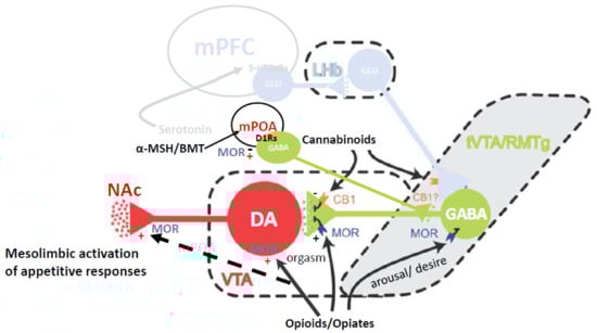Opiates and opioids are well known for their rewarding or positively reinforcing properties. Morphine and β-endorphin both induce CPP and support both peripheral and intracranial self-administration [,,,,]. Likewise, copulation and ejaculation in males, or paced copulation/distributed CLS in females, are crucial rewarding events in the establishment of CPP [], CEP [,], and conditioned partner preference []. As with all reward-related learning, the administration of the opioid receptor antagonist NAL or naltrexone block the acquisition of these conditioned responses indicating that endogenous opioid transmission is critical. Indeed, whole-brain β-endorphin content increases dramatically after ejaculation in male rats [], with specific increases in enkephalin content observed in the midbrain and hypothalamus []. Copulation to ejaculation also induces µ-receptor internalization (a marker of ligand-induced receptor activity) in the mPOA [] and VTA []. More specifically, it has been shown that different numbers of ejaculations render different µ- and δ-receptor internalization in the VTA, and although the internalization of both receptors increased as a result of ejaculation, only µ-receptor internalization was correlated with the number of times a male ejaculated [,], suggesting that this receptor carries the reward or pleasure signal. Indeed, bilateral infusions of DALA to the mPOA, induce significant CPP []. These data are consistent with the overall notion of μ receptors in many reward-related regions of the brain carrying the reward signal (e.g., []), with δ receptors in the NAc shell further enhancing reward []. The reward signal impinges on neural systems for motivation, or more specifically, desire and attention (see Figure 4).