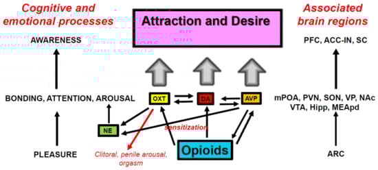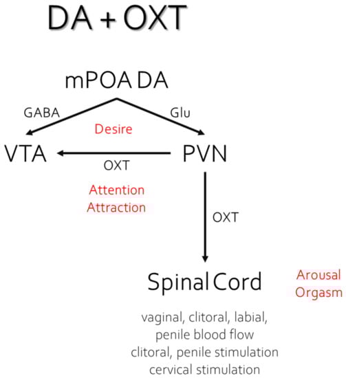 Of the many neuropeptides that modulate sexual behavior, OXT and AVP figure prominently in sexual arousal [,,,] and the establishment of monogamous partner preferences in prairie voles [,,,,,,]. As mentioned above, the mating-induced preference by male prairie voles for a familiar female can be inhibited by naltrexone, suggesting that opioids play an important role in their development. However, so does DA. Opioids and DA both participate in the sensitization and activation of OXT and AVP neurons. The following two populations of OXT neurons exist in rats and other rodents that comprise two systems within the PVN and SON of the hypothalamus []: small parvocellular neurons that project largely to midbrain (periaqueductal grey), brainstem, and spinal cord, and larger magnocellular neurons that project diffusely to limbic and forebrain sites, and to the posterior pituitary [,,]. Parvocellular OXT neurons also make direct dendritic contact with magnocellular OXT neurons in the SON [] and regulate OXT release from those neurons into the posterior pituitary vasculature. Thus, OXT can coordinate sexual arousal with partner preference by both central and peripheral actions.