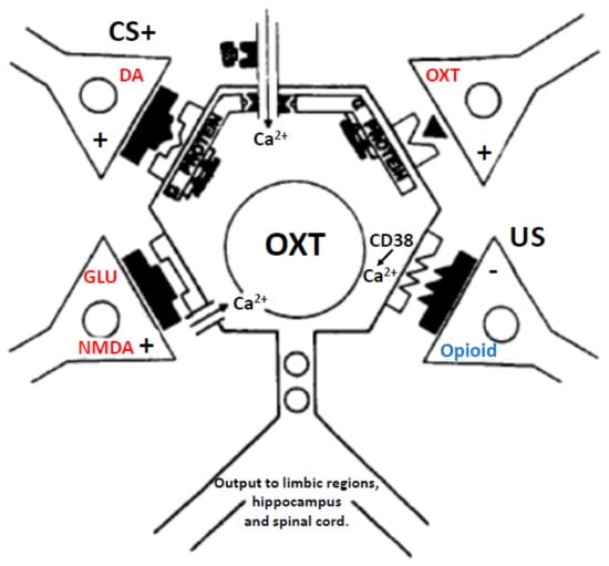 Synaptic inputs to OXT neurons in the PVN and possibly the SON. In this scheme, the CS + signal is carried by augmented incerto-hypothalamic DA transmission driven by sensitized mesolimbic DA. The US signal is carried by opioid transmission acting on μ opioid receptors. Although this signal inhibits OXT cell membranes, it leads to an augmentation of CD38 gene transcription, mobilization of Ca2+, and sensitization of OXT transmission when neurons are stimulated (in this case by DA, but potentially also by OXT and N-methyl D-aspartate [NMDA] glutamate [GLU] inputs).