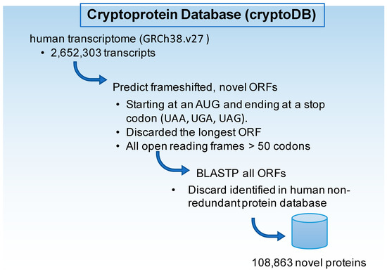 - Laumont, C.M.; Daouda, T.; Laverdure, J.-P.; Bonneil, É.; Caron-Lizotte, O.; Hardy, M.-P.; Granados, D.P.; Durette, C.; Lemieux, S.; Thibault, P. Global proteogenomic analysis of human MHC class I-associated peptides derived from non-canonical reading frames. Nat. Commun. 2016, 7, 10238. [Google Scholar] [CrossRef]