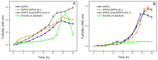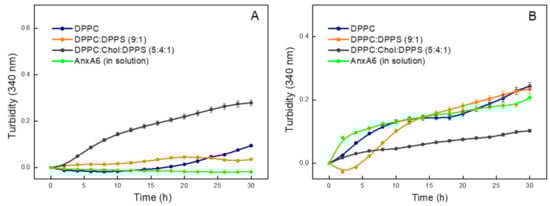 To obtain the nucleation curves, the monotonic step was subtracted from the turbidity curves in the case of AnxA6 mixed with PS–CPLX and each of the liposomes (DPPC, DPPC:DPPS (9:1), or DPPC:Chol:DPPS (5:4:1)) (Figures S1–S3 in Supplementary Material).