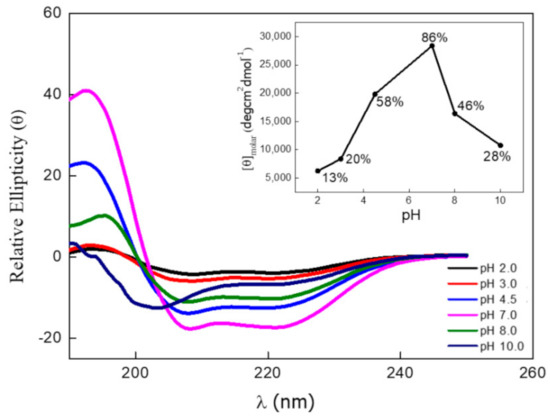 Circular dichroism spectra were recorded with a Jasco 810 spectrophotopolarimeter equipped (Hachioji-shi, Japan) with a Peltier thermostatic system under constant nitrogen flux at 25 °C and with a 0.1 cm quartz cuvette. The protein concentration was in the range of 0.44 mg·mL−1 at different pH values. The circular dichroism spectrum of each sample was measured three times at a scan rate of 50 nm.min−1.