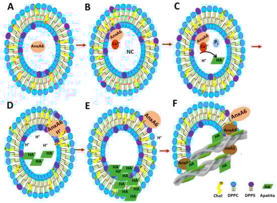 Representation of the action mechanism of annexins during MV-mediated mineralization: (A) AnxA6 can be localized in the lumen of MVs at low calcium concentrations (Ca2+). AnxA5 can be bound to membrane bilayer; (B) Accumulation of Ca2+ and inorganic phosphate (Pi) inside MVs favors the binding of AnxA6 to the inner leaflet of the MV membrane bilayer in a Ca2+-dependent manner, forming a nucleational core and initiating apatite formation; (C) During apatite formation, protons (H+) are released, inducing the protonation of AnxA6 and rendering it more hydrophobic due to an ionization potential around 5.5. Protonated AnxA6 can translocate within the MV bilayer; (D) Apatite crystals inside the vesicles continue growing up, breaking the membrane of MVs, exposing the HA crystals to the extracellular matrix, and releasing the H+ which decreases the local pH; (E) AnxA6 can be deprotonated and released to the external surface of MVs. (F) AnxA5 present in the membrane bilayer showed a high affinity to collagen binding. Thus, AnxA5 can promotes the adhesion of MVs to collagen fibers, allowing the deposition of the HA crystals on the extracellular matrix.