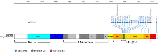 - Ahel, J.; Lehner, A.; Vogel, A.; Schleiffer, A.; Meinhart, A.; Haselbach, D.; Clausen, T. Moyamoya disease factor RNF213 is a giant E3 ligase with a dynein-like core and a distinct ubiquitin-transfer mechanism. Elife 2020, 9, e56185. [Google Scholar] [CrossRef]