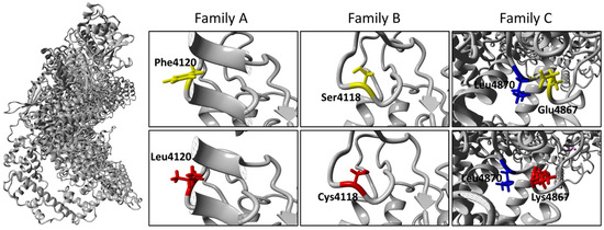 | Protein | p.Phe4120Leu | p.Ser4118Cys | p.Glu4867Lys | |||