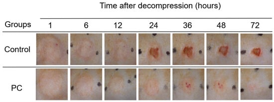 Photographs of PI wounds in two groups from 1 to 72 h after decompression. PI: pressure injury. PC: preconditioning.