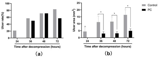 Ulcer rate (a) and ulcer area (b) after decompression in two groups. * p < 0.05. PC: preconditioning.