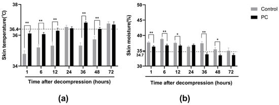 Before the experiment, we measured the dorsal skin temperature and skin moisture of the same rats without injuries. The normal rat skin temperature was 36.4 ± 0.5 °C, and the normal skin moisture was 34.7 ± 1.8%. At 1 and 72 h after decompression, the skin temperature of the control decreased and was lower compared with the PC group (p < 0.05: except 24 and 72 h, Figure 3a); however, it remained normal in the PC group. We further compared the skin moisture between the two groups. As shown in Figure 3b, the skin moisture of the two groups increased compared with the normal skin moisture in rats without injuries, and hydrotherapy resulted in skin moisture that was lower compared with the control group after decompression. Skin moisture became normal after 36 h in the PC group.