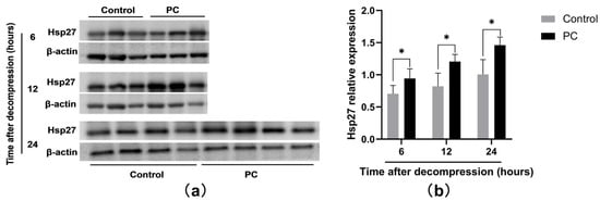 To explore the possible molecular mechanisms responsible for the prevention of ulceration induced by hydrotherapy, we investigated the expression of Hsp27 of PI wounds at 6, 12, and 24 h after the compression was released. Figure 4a demonstrated Western blot analysis of Hsp27 of the two groups. In Figure 4b, the PC group showed a considerably higher expression of Hsp27 after decompression compared with the control group (p < 0.05).