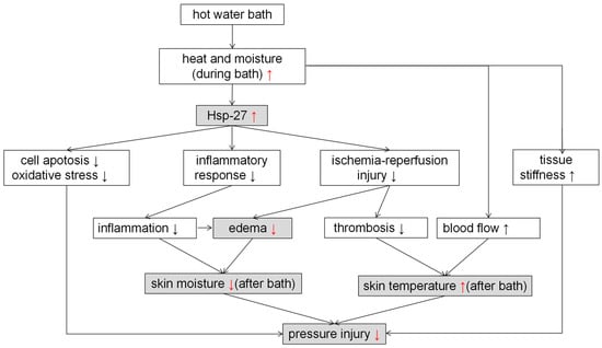 An important aspect of the stress response is the potential to induce higher levels of stress tolerance and an increased resistance to subsequent damage from more than one type of stress []. Repeated mild-heat-stress-induced hormesis is beneficial in differentiation, wound healing, and angiogenesis []. During HSR, cells activate a signaling pathway that expresses Hsp. The hormetic response correlates with changes in the expression levels of Hsp27 []. Hsp27 is a member of a small HSP family and is constitutively expressed in cells. Its main functions include modulating the ability of cells to respond to several types of injury, such as heat shock and oxidative stress []. It can be rapidly activated at elevated temperatures. Mao et al. found that after heating with hot water, Hsp27 expression in tongue squamous cell carcinoma increased continuously for 12 h []. Similarly, the exposure of mesenchymal stem cells to high temperature (43 °C) was associated with an increased secretion of Hsp 27, which may have contributed to the increased cell survival []. The interaction between oxidative stress and apoptosis plays an important role in the formation of early PI []. After being subjected to oxidative stress, cells produce reactive oxygen species, various inflammatory cytokines, and other harmful substances, which leads to cell damage and PI. Our results show that hydrotherapy preconditioning relieves skin damage and reduces PIs. Geum et al. reported that heat shock preconditioning of neural progenitor cells at 43 °C for 3 h could reduce cell apoptosis []. Likewise, the short-term culture of cardiac progenitor cells at 42 °C reduces apoptosis, increases the functionality, and reduces the fibrosis of mouse ischemic myocardium []. These findings may contribute to an understanding of the upregulation of Hsps [,]. In our study, the expression of Hsp27 increased after hydrotherapy preconditioning. Hsp27 is involved in cellular protection in response to various stresses, including stress and heat shock []. It can reduce the production of harmful substances, such as reactive oxygen species. Furthermore, it can protect cells against an induction of cell death (including apoptosis and necrosis). Zou et al. reported that Hsp27 promotes vascular smooth muscle cell viability, suppresses cell apoptosis, and confers protection against oxidative stress [], thus reducing the development of PIs.