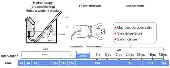 Figure 6 shows the protocol of the study design. The PC group underwent hydrotherapy thrice a week at 08:00 a.m. for 4 weeks. The day after the last bath, PI models were constructed at 08:00 a.m. After decompression for 1, 6, 12, 24, 36, 48, and 72 h, skin appearance, temperature, and moisture of PI sites were observed. The measurement sites were consistently managed by marking them with an insoluble marking pen for a high uniformity in the measurement. Skin samples of PI wounds were obtained at 6, 12, and 24 h after decompression for Hsp27 analysis.