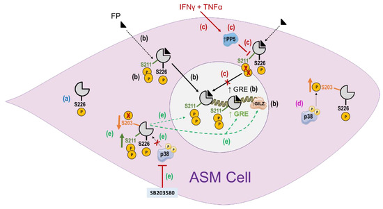 In contrast to immune cells, p38 MAPK negatively regulates GC responsiveness in ASM cells via direct GR phosphorylation of Ser203 but not Ser226 residues. Indeed, we previously showed that while the inhibition of p38-MAPK using SB203580 in ASM cells increased GR phosphorylation at Ser211, it decreased GR phosphorylation at Ser203 and had no effect on GR phosphorylation at Ser226 [85]. Additional mechanistic studies using GR-Ser203A mutant, MAPK kinase 3 expression vector (a specific kinase that directly activates p38 MAPK), and p38 active kinase demonstrated that the inactive state of the GR under resting conditions is not only preserved by the absence of GR ligands but also relies on p38 MAPK-dependent phosphorylation of the “unliganded” GR at Ser203. Treatment of ASM cells with GC reduced basal p38 MAPK expression as well as basal GR-Ser203, thereby enhancing GR-Ser211 phosphorylation and GR-mediated transactivation activities [85].