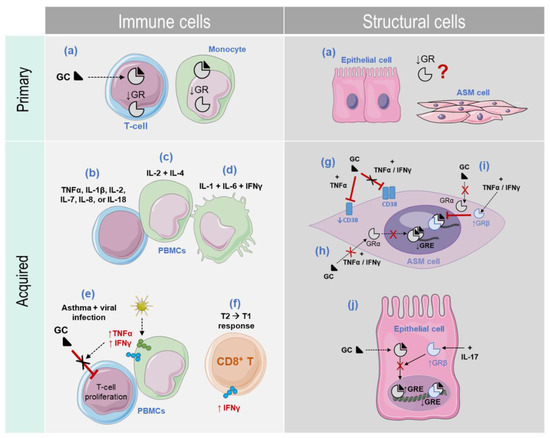 Acquired GCI, however, does heavily depend on inflammation and represents the most frequent form of GCI [76]. Initially, acquired GCI was described to occur only in immune cells such as PBMCs and airway T-cells [98]. For instance, different in vitro studies showed that acquired GCI can be promoted by mono- (TNFα, IL-1β, IL-2, IL-7, IL-8, or IL-18), bi- (IL-2 and IL-4) [98], or multi- (IL-1, IL-6, and IFNγ) stimulation with inflammatory cytokines [99] (Figure 2). Amongst these cytokines, the involvement of TNFα and IFNγ in GCI in asthma received significant attention over the past decades. A pioneering study by Vianna and colleagues [100] showed that the anti-proliferative effects of dexamethasone in T-cells obtained from patients with asthma during respiratory infection, but not during the recovery phase, were significantly reduced. Such a reduction was associated with high expression levels of TNFα and IFNγ.