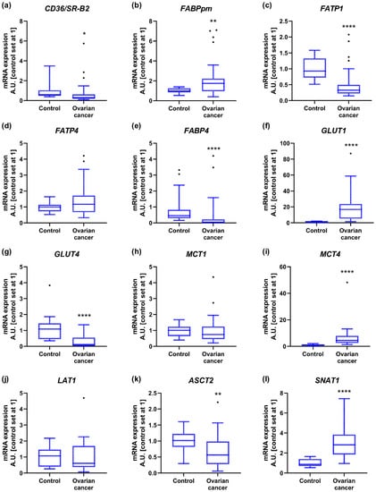 Transcript levels of (a) cluster of differentiation 36/a scavenger receptor class B protein, (b) membrane associated fatty acid binding protein, (c) fatty acid transport protein 1, (d) fatty acid transport protein 4, (e) fatty acid binding protein 4, (f) glucose transporter 1, (g) glucose transporter 4, (h) monocarboxylate transporter 1, (i) monocarboxylate transporter 4, (j) Na+-independent neutral amino acid transporter, (k) Na+-dependent neutral amino acid transporter and (l) Na+-coupled neutral amino acid transporter 1 in ovarian control (n = 14) and cancer tissue (n = 27). Measurements were made in duplicate, and arithmetic means were used for subsequent investigation. Results are expressed in arbitrary units with control set as 1 and presented as median (min to max) value. Differences statistically significant at: * p < 0.05, ** p < 0.01, **** p < 0.0001.