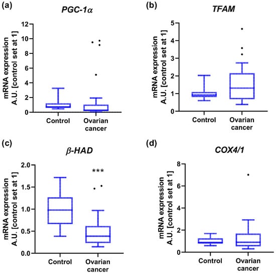 Transcript levels of (a) peroxisome proliferator-activated receptor gamma co-activator 1α, (b) mitochondrial transcription factor A, (c) acetyl-CoA acyltransferase and (d) cytochrome c oxidase subunit 4 isoform 1 in ovarian control (n = 14) and cancer tissue (n = 27). Measurements were made in duplicate and arithmetic means were used for subsequent investigation. Results are expressed in arbitrary units with control set as 1 and presented as median (min to max) value. Differences statistically significant at *** p < 0.001.
