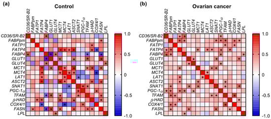Heat map of correlations between the expression of energy substrate transporters and mitochondrial genes in (a) ovarian control and (b) cancer tissue. The relationships between the analyzed parameters were assayed via Spearman correlation coefficient. Correlations that were statistically significant (p < 0.05) are indicated with an asterisk.