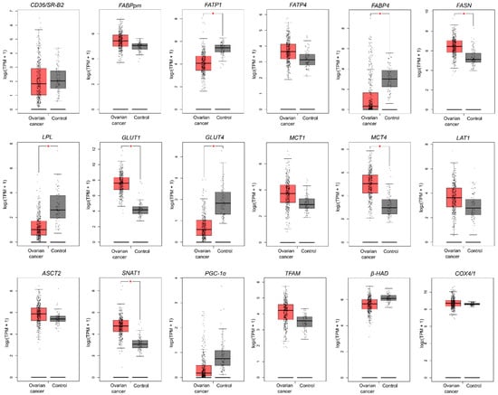 The transcription level of metabolism-related genes that significantly differed between ovarian cancer (n = 426) and control tissue (n = 88). Data are based on the TCGA cancer cohort and GTEx control samples. Data derive from The Gene Expression Profiling Interactive Analysis (GEPIA) database based on the TCGA-OC dataset and normal ovarian tissues (GTEx, Genotype-Tissue Expression project). Differences statistically significant at * p < 0.05.