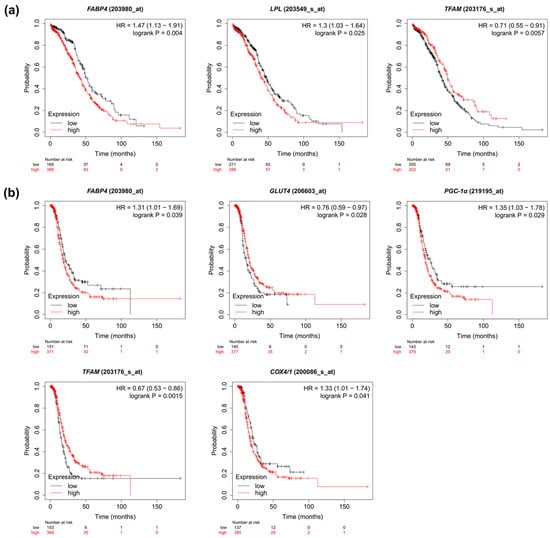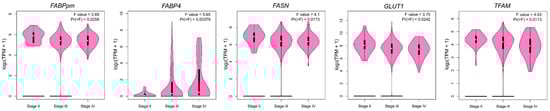 To investigate the relationship between the expression of metabolism-related genes in OC and the clinical data, we analyzed overall survival, progression-free survival and clinical stage-related level for each gene. For overall survival analysis, higher FABP4 and LPL and lower TFAM indicated poorer prognosis (Figure 5a and Figure S3). In the case of progression-free survival, higher expression of FABP4, PGC-1α and COX4/1 indicated worse, while higher levels of GLUT4 and TFAM correlated with better patient progression-free survival (Figure 5b and Figure S4). Furthermore, the expression of FABPpm, FABP4, FASN, GLUT1 and TFAM correlated with the clinical stage of OC (Figure 6 and Figure S5).