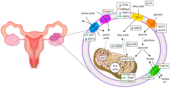 The development of ovarian cancer requires an adequate energy supply, which is facilitated by the interactions between cancer cells and the tumor milieu [,]. The heterogeneous nature of OC manifests through the co-presence of cells highly dependent on glucose that shift their metabolism towards anaerobic processes even in the presence of oxygen, and ovarian cancer cells that rely on aerobic processes such as oxidative phosphorylation []. Glycolysis not only enables fast provision of ATP, but also generates intermediates that are further incorporated in the biosynthesis of amino acids and lipids. Free fatty acids play a crucial role in energy production, membrane synthesis in cancer cells and oncogenic signaling [], while their bioavailability is enhanced in a neoplastic environment []. As part of metabolic alterations, elevated rates of fatty acid synthesis due to increased expression of various lipogenic enzymes could account for cancer progression []. Moreover, if phospholipids with saturated fatty acids are abundantly expressed in cancer membranes, cancer cells are less prone to respond to chemotherapy, which also highlights the role of free fatty acids in cancer physiology []. Amino acids are indispensable for tumor growth as they provide nitrogen for purine and pyrimidine synthesis, serve as precursors in protein and glutathione biosynthesis, and are involved in a vast number of tumor signaling and gene expression pathways, e.g., extracellular signal-regulated protein kinase (ERK) or mammalian target of rapamycin (mTOR) cascades [,]. In particular, an increase in glutamine dependency in high-invasive OC preserves mitochondrial integrity by supporting reactive oxygen species (ROS) scavenging mechanisms and replenishing tricarboxylic acid cycles for energy generation []. Differences in predominantly used energy substrates occur even in patients with similar OC histopathological type, underlining the importance of metabolic adjustments in cancer progression []. According to The Cancer Genome Atlas, HGSC can be classified into immunoreactive, proliferative, differentiated, and mesenchymal cell types based on RNA sequencing and microarray data analysis []. Fatty acid, glucose and amino acid transporters contribute to the development, growth and metastasizing of OC, and thus become potential targets for energy metabolism-based molecular and novel cancer therapy in OC patients.