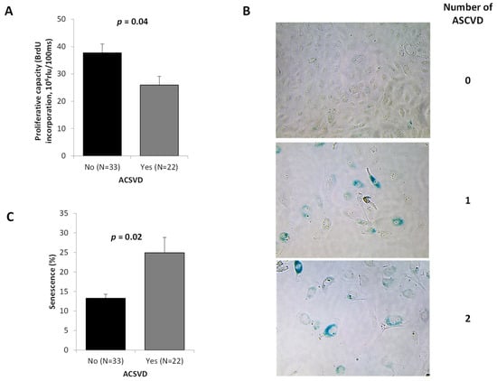 ASCVD patients showed a lower ECFC proliferation (Figure 2A, p = 0.04), this proliferation defect being more marked in ECFC from patients with ASCVD in more than one territory (data not shown). Reduced growing capacity was associated with morphological changes and appearance of enlarged flattened cells among ECFC from ASCVD patients (Figure 2B). Using SA-β-galactosidase staining, we found that ASCVD patients showed a higher ECFC senescence (Figure 2B,C, p = 0.02), especially in the case of more than one territory of ASCVD (data not shown).
