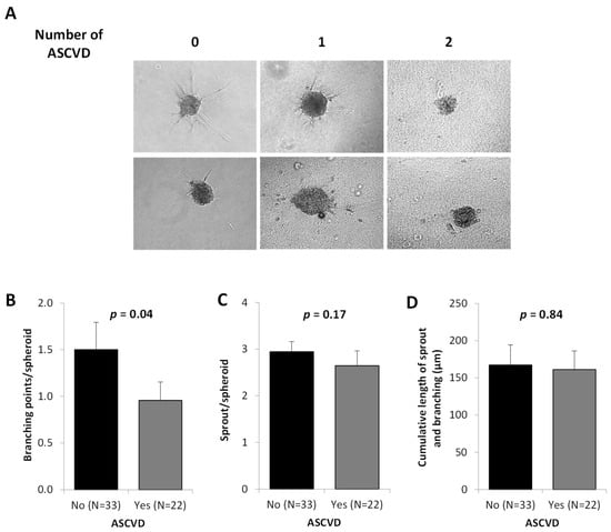 In a 3D spheroid assay, we observed an alteration in the vasculogenic capacities of ECFC from ASCVD patients (Figure 3A) expressed by fewer branching points/spheroid than controls (Figure 3B, p = 0.04) without any modulation of the sprout number/spheroid (Figure 3C) or the cumulative length (Figure 3D). However, we observed a clear reduction in the sprout number, branching points, as well as cumulative length for the patient presenting ASCVD in more than one territory (data not shown).