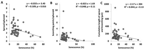 Relation between senescence and angiogenic functions of ECFC. (A) Senescence according to the number of sprouts per spheroid. (B) Senescence according to the number of branching points per spheroid. (C) Senescence according to the cumulative length per spheroid. R2 and p are from Pearson correlation.
