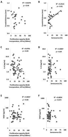 Relations between ECFC proliferative capacity or senescence and clinical characteristics. (A,B) Carotid thickness (mm) according to the proliferative capacity and the senescence of ECFC. (C,D) IL-6 level according to the proliferative capacity and the senescence of ECFC. (E,F) VEGF level according to the proliferative capacity and the senescence of ECFC. R2 and p are from Pearson correlation. IL-6 indicates Interleukin 6 and VEGF indicates vascular endothelium growth factor.