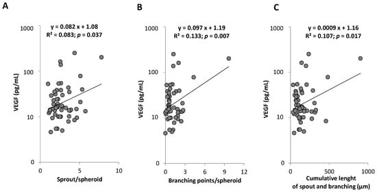 Relation between VEGF level and angiogenic function of ECFC. (A) VEGF level according to the number of sprouts per spheroid (B) VEGF level according to the number of branching points per spheroid (C) VEGF level according to the cumulative length per spheroid. R2 and p are from Pearson correlation. VEGF indicates vascular endothelium growth factor.