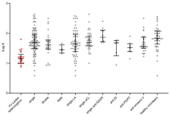 Visualization of TGA tLag R in each group by scatter dot plots including median and quartiles. TGA: thrombin generation assay; tLag R: lag phase 1/(tLag − APC/tLag + APC). The group of FV Leiden heterozygotes as a standard of thrombogenicity is shown by the red shaded points.