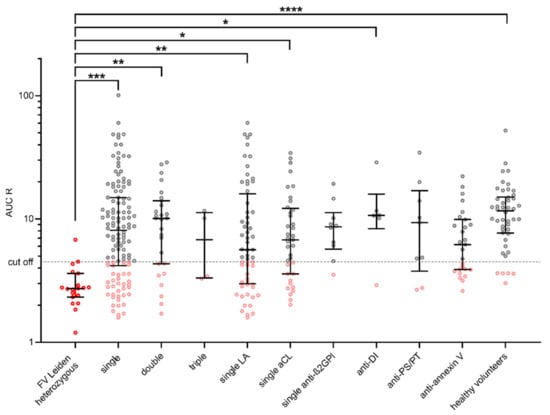 Visualization of AUC R in each group by scatter dot plots including median and quartiles. Cut-off for AUC R ≤ 4.5 (90th percentile of AUC R in patients with FV Leiden heterozygous). TGA: thrombin generation assay. AUC R: ratio of area under the curve AUC − APC/AUC + APC. On the basis of this cut-off value, patients were assessed as high- or low-thrombogenic. Statistically significant differences between groups using ANOVA are shown above the graph (*, **, *** and **** for p values <0.05, <0.01, <0.001, and <0.0001, respectively). The group of FV Leiden heterozygotes as a standard of thrombogenicity is shown by the red shaded points. Values below the cut-off for each antibody type are shown in pink.