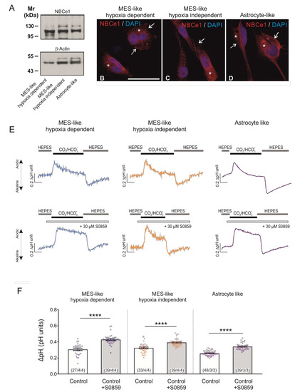 Baseline protein expression of NBCe1 and active NBC transport in glioblastoma cellular types. (A) Protein abundance of NBCe1 by immunoblotting in mesenchymal-(MES)-like hypoxia-dependent, MES-like hypoxia-independent and astrocyte-like glioblastoma cells; 10 µg protein was loaded per lane. The blots are representative of three different experiments. (B–D) Immunofluorescence for NBCe1 (red) and subsequent confocal microscopy in different glioblastoma cellular subtypes. Arrows point to membrane NBCe1 and asterisks indicate intracellular NBCe1 distribution. Nuclear staining with DAPI. Scale bar: 50 µm. (E) Analysis of NBC transport activity in MES-like hypoxia-dependent and hypoxia-independent cells, as well as in astrocyte-like glioblastoma cellular subtypes. Original recordings of intracellular pH in cultured GBM cells during change of perfusion solution from HEPES-buffered to saline solution buffered by 5% CO2/26 mM HCO3- and back to HEPES in the presence or absence of 30 µM of the NBC inhibitor S0859. (F) Bar plots showing the change in intracellular pH peak amplitude. **** p < 0.0001, compared to the controls, using the two-tailed Student’s t-test and Mann–Whitney Rank Sum test (for MES-like cells). The number of cells/coverslips/cultures used in the experiments is indicated in the respective columns.