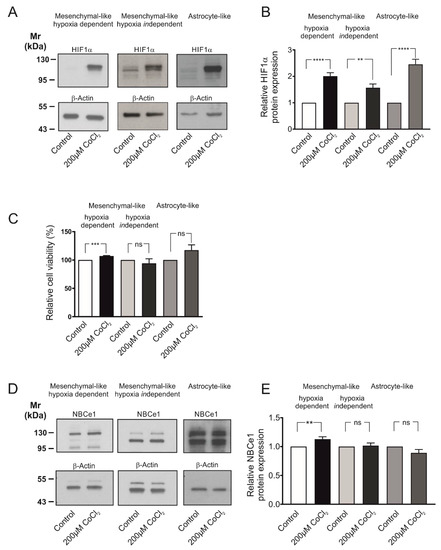 Cell viability and regulation of NBCe1 protein abundance in different glioblastoma cellular subtypes following exposure to chemical hypoxia. (A) Immunoblot analysis for hypoxia-inducing factor 1 α (HIF-1α) in MES-like hypoxia-dependent and hypoxia-independent cells, as well as in astrocyte-like glioblastoma cell types following exposure of the cells to 200 µM CoCl2 for 24 h. (B) Quantification of the data. ** p < 0.01 and **** p < 0.0001 for significant increase after densitometric analysis of the signal ratio HIF-1α: β-Actin and two-tailed unpaired Student’s t-test. Data are presented as mean ± S.E.M. The blots are representative for 5–9 different experiments; 10–30 µg protein was loaded per lane. The value of untreated controls was set to 1. (C) Viability of GBM cells following chemical hypoxia was quantified with the MTT assay. Data are given as relative numbers (%) following 200 µM CoCl2, compared to the untreated controls (*** p < 0.001, and ns: not significant using two-tailed unpaired Student’s t-test, n = 3). (D) Immunoblot analysis of NBCe1 protein in MES-like hypoxia-dependent and hypoxia-independent cells, as well as in astrocyte-like GBM cells following induction of chemical hypoxia for 24 h. (E) Quantification of the data. ** p < 0.01 for significant increase and ns: not significant after densitometric analysis of the signal ratio NBCe1: β-Actin and two-tailed unpaired Student’s t-test. Data are presented as mean ± S.E.M. The blots are representative for 3–10 different experiments. 10–30 µg protein was loaded per lane. The value of untreated controls was set to 1.