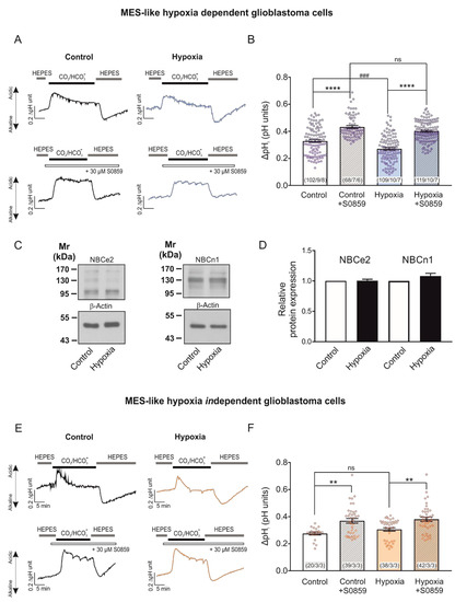 Moreover, to investigate whether NBC transport is active in GBM cells, intracellular pH recordings were performed in cultured cells loaded with the H+-selective dye BCECF (Figure 1E). When the bathing solution was switched from a HEPES-buffered, nominally CO2/HCO3−-free saline solution to saline buffered by 5% CO2/26 mM HCO3−, a transient intracellular acidification was observed in all glioblastoma cellular subtypes investigated. The peak amplitude of this acidification was different in the absence or presence of 30 µM of the NBC blocker S0859. Quantification of the data (Figure 1F) showed that the peak amplitude upon inhibition of NBC was significantly larger in MES-like hypoxia dependent (0.43 ± 0.01 pH units), MES-like hypoxia independent (0.39 ± 0.01 pH units) and AC-like GBM cells (0.34 ± 0.01 pH units), compared to their controls in the absence of the inhibitor (0.30 ± 0.01, 0.32 ± 0.01 and 0.26 ± 0.00 pH units, respectively; **** p < 0.0001, using two-tailed unpaired Student’s t-test (in AC-like cells) and the Mann–Whitney Rank Sum test (in both MES-like cells; Figure 1F). These data demonstrate the presence of active NBC transport in all glioblastoma cellular subtypes investigated.