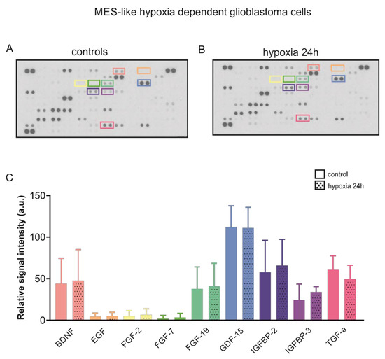 Cytokine profile following hypoxia in MES-like hypoxia-dependent GBM cells. Secretome analysis in supernatant from control mesenchymal-like hypoxia dependent glioblastoma cells (A) and in those exposed to chemical hypoxia for 24 h (B) using the Proteome profilerTM Human XL Cytokine Array (R&D Systems). (C) Quantification of the data. No differences were observed in the relative levels of selected secreted cytokines (coloured boxes).