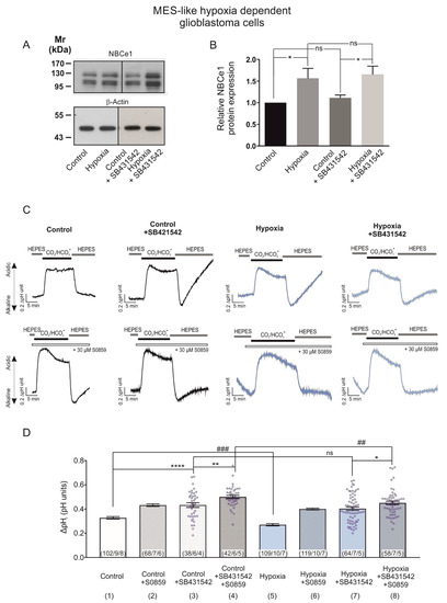 2.6. Extracellular Acidosis Does Not Regulate Hypoxia-Induced HIF-1α Expression but Reduces NBCe1 Transport in MES-Like Hypoxia Independent GBM Cells