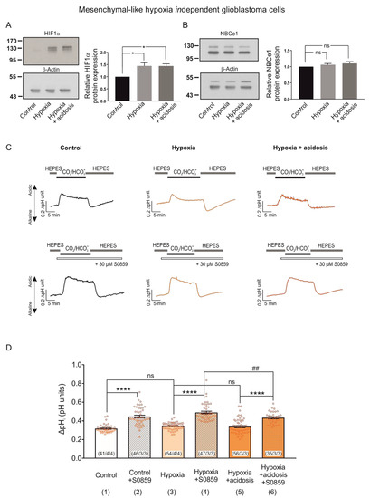 In contrast to the results obtained in MES-like hypoxia-dependent GBM cells (Figure 6A), the hypoxia-induced HIF-1α upregulation persisted in the presence of low extracellular pH (Figure 7A, 1.44 ± 0.13-fold and 1.44 ± 0.09-fold for hypoxia and hypoxia & acidosis, respectively, compared to the controls; * p < 0.05, using one-way ANOVA and Bonferroni post hoc test, n = 6). Moreover, protein level of NBCe1 (Figure 7B) was comparable between the experimental groups (1.06 ± 0.04-fold and 1.10 ± 0.05-fold for hypoxia and hypoxia in combination with acidosis, respectively, compared to the untreated controls, not significant (ns) using one-way ANOVA and Bonferroni post hoc test, n = 6).