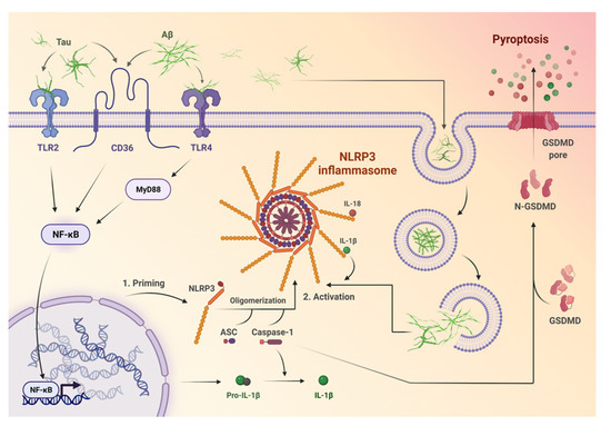 The mechanisms of priming and activation of the NOD-like receptor pyrin domain-containing 3 (NLRP3) inflammasome. Firstly, protein aggregates (Aβ and tau) are recognized by microglial pattern recognition receptors, such as Toll-like receptors (e.g., TLR2, TLR4), or cluster of differentiation 36 (CD36). Afterwards, they induce activation of specific pathways like MYD88/NF-κB, which leads to transcription of pro-IL-β and NLRP3. One of the NLRP3 domains—the adaptor molecule apoptosis-associated speck-like protein containing a caspase recruitment domain (ASC)—recruits pro-caspase-1, which enables the release of inflammatory cytokines, namely IL-18 and IL-β. Further, cell death in the form of pyroptosis occurs after the activation of NLRP3 via the induction of gasdemin D (GSDMD). GSDMD can induce membrane-disrupting cytotoxicity and facilitates the secretion of inflammatory cytokines via the creation of pores in the cell membrane.