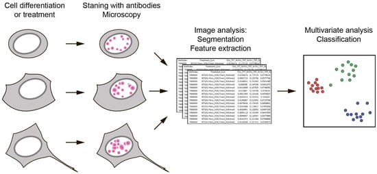 In 2019, Terskikh and coworkers proposed a new method called Microscopic Imaging of Epigenetic Landscapes (MIEL) []. At the first stage, immunocytochemical staining of fixed cells with antibodies specific to the selected histone modifications and their fluorescence microscopy was performed. This makes it possible to visualize intranuclear patterns (landscapes) of fluorescent signals characteristic of each type of modification in these cells. At the second stage, the obtained arrays of images of individual nuclei were subjected to mathematical analysis. Multivariate image analysis and machine learning [] allowed one to identify several hundred features of these landscapes and compare different cell samples with each other in a virtual multidimensional space using multidimensional scaling (MDS) (Figure 1).