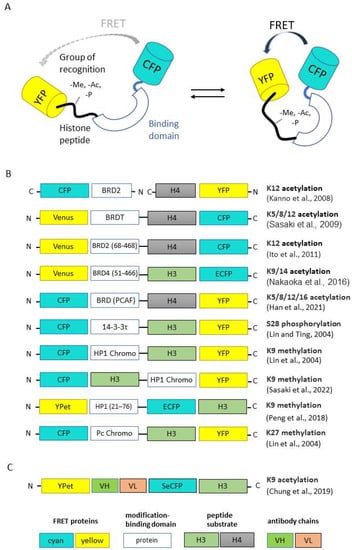 - Chung, C.-I.; Sato, Y.; Ohmuro-Matsuyama, Y.; Machida, S.; Kurumizaka, H.; Kimura, H.; Ueda, H. Intrabody-Based FRET Probe to Visualize Endogenous Histone Acetylation. Sci. Rep. 2019, 9, 10188. [Google Scholar] [CrossRef]