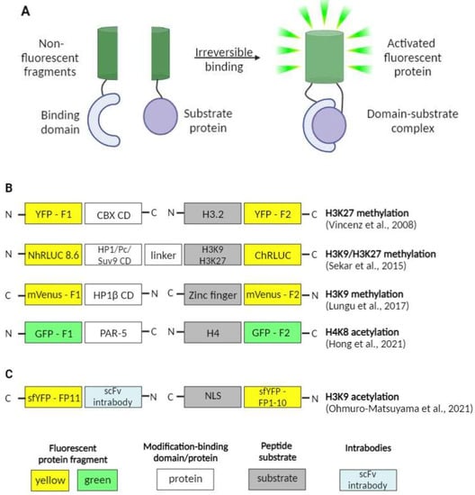 In a very recent work, Ohmuro-Matsuyama et al. addressed the issue of visualization of histone acetylation marks and the effects of histone deacetylase (HDAC) inhibitors []. They focused on the detection of the H3K9ac modification, a mark that is found to be involved in diseases as serious as Alzheimer’s disease [], autism spectrum disorder [] as well as several cancers [,]. For that, they used a split-YFP system, in which the fluorescent protein (sfYFP) was split into two uneven fragments. The smaller one was fused to the NLS (NLS-FP1-10), and the bigger one was brought together with the scFv intrabody (scFv-FP11). Intrabodies are stable antibodies that are able to retain their structures even in the cytoplasm and nucleus. When both of the probes are co-expressed in a live cell; the one with the NLS uses the nuclear import machinery and becomes accumulated in the nucleus. The nuclear levels of the second probe depend directly on the levels of H3K9ac. Additionally, the more abundant it becomes in the nucleus, the more scFv-FP11–NLS-FP1-10-binding events occur, leading to sfYFP reconstitution and increase in fluorescence signal, which allows for the detection and evaluation of HDAC inhibitor activity (Figure 4).