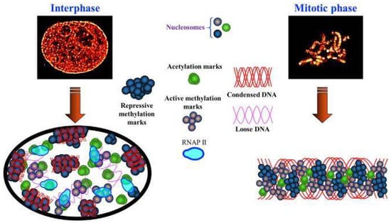 Model to illustrate the spatial organization of the chromatin environment at interphase and mitotic phases. Three distinct structural groups of active histone acetylation, active histone methylation, and repressive histone methylation, as well as their spatial relationship with active transcription machinery are shown. Modified from [].