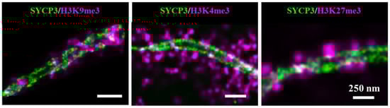 Prakash et al. aimed to demonstrate the power of SMLM to describe the epigenetic landscape of pachytene chromosomes []. They revealed three distinct spatial morphologies in the chromosome structure of pachytene stage of meiosis prophase I: (i) radial chromatin identified by H3K4me3 indicative of actively transcribed chromatin, (ii) polar chromatin identified by H3K9me3 indicative of centromeric chromatin, and (iii) tangential chromatin identified by H3K27me3 indicative of repressed chromatin (Figure 7).