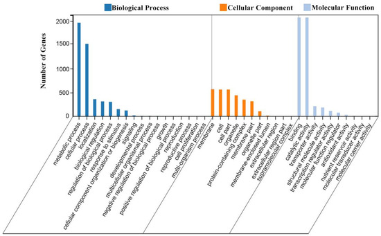GO analysis was performed on the set of DEGs identified between the two cultivars at different times with a p-value ≤ 0.05 (Figure 4; Table S6). The GO analysis results were divided into three main categories: biological process, cellular component and molecular function. In the classification of biological processes, DEGs were annotated to a total of 17 significant entries. The metabolic process, cellular process, localization, biological regulation, regulation of biological process and response to stimulus entries were enriched with large numbers of DEGs (≥150 DEGs), especially in the metabolic process category, which included the most enriched DEGs. In the classification of cellular components, DEGs were annotated to a total of 11 significant entries, among which the DEGs were abundantly enriched in the membrane, cell, cell part, organelle, protein-containing complex and membrane part entries. In the classification of molecular function, DEGs were annotated to 10 significant entries. The entries for binding, catalytic activity, transporter activity and structural molecule activity were associated with a large number of DEGs. Thus, the GO classification analysis suggested that DEGs associated with flowering reversion in tomato may be involved in cellular metabolism, cellular components, binding and catalysis.
