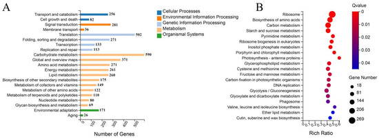 KEGG pathway enrichment analysis was also performed on the set of DEGs screened via transcriptome sequencing in three different periods for both the ‘116’ and ‘117’ varieties (Figure 5, Table S7). The KEGG classifications were divided into five categories: cellular processes, environmental information processing, genetic information processing, metabolism and organismal systems (Figure 5A). In the cellular processes category, transport and catabolism (256 DEGs) and cell growth and death (82 DEGs) were significantly enriched. In the environmental information processing category, signal transduction (284 DEGs) was significantly enriched. In the genetic information processing category, translation (352 DEGs) and folding as well as sorting and degradation (248 DEGs) entries were significantly enriched. The largest number of DEGs was enriched in the metabolism category, and these genes were concentrated in the carbohydrate metabolism (540 DEGs), carbohydrate metabolism (540 DEGs), global and overview maps (335 DEGs), amino acid metabolism (272 DEGs) and lipid metabolism (271 DEGs) entries. During the KEGG pathway enrichment analysis of these DEGs, the top 20 most significant pathways were selected by ranking the significantly enriched pathways from lowest to highest according to Q-values ≤ 0.05. The biosynthesis of amino acids (ko01230, 379 DEGs), starch and sucrose metabolism (ko00500, 288 DEGs), glycerophospholipid metabolism (ko00564, 142 DEGs), carbon metabolism (ko01200, 424 DEGs) and glycolysis/gluconeogenesis (ko00010, 212 DEGs) pathways were significantly enriched, as shown in Figure 5B.