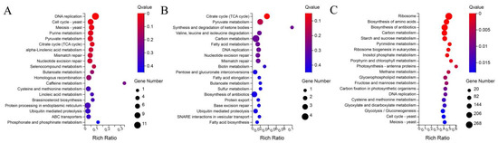 To gain more insight into the enrichment of these DEGs in KEGG pathways, we performed separate KEGG enrichment analyses of the DEGs from the three different developmental stages of the two cultivars, as shown in Figure 6. In the early stage, these DEGs were mainly concentrated in the DNA replication, cell cycle, meiosis and citrate cycle (TCA cycle) categories (Figure 6A). In the middle stage, citrate cycle (TCA cycle) entries were still the most enriched entries, except for carbon metabolism and pentose and glucuronate interconversions, which were also enriched with large numbers of DEGs (Figure 6B). In the later period, the most enriched entries were ribosome, biosynthesis of amino acids, biosynthesis of antibiotics, carbon metabolism, starch and sucrose metabolism and photosynthesis antenna proteins (Figure 6C).